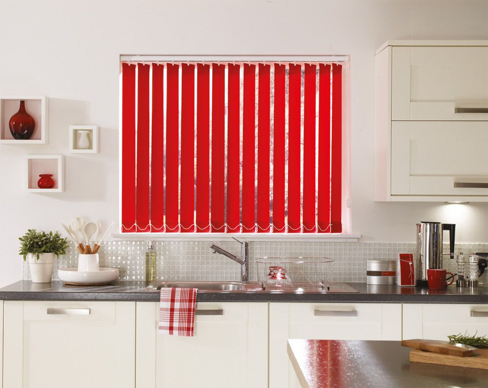 Занавески с красными ламелями притягивают взгляд. Такой декор подходит не для каждой комнаты. Возбуждающий оттенок штор используют для гостиных, кухонь.