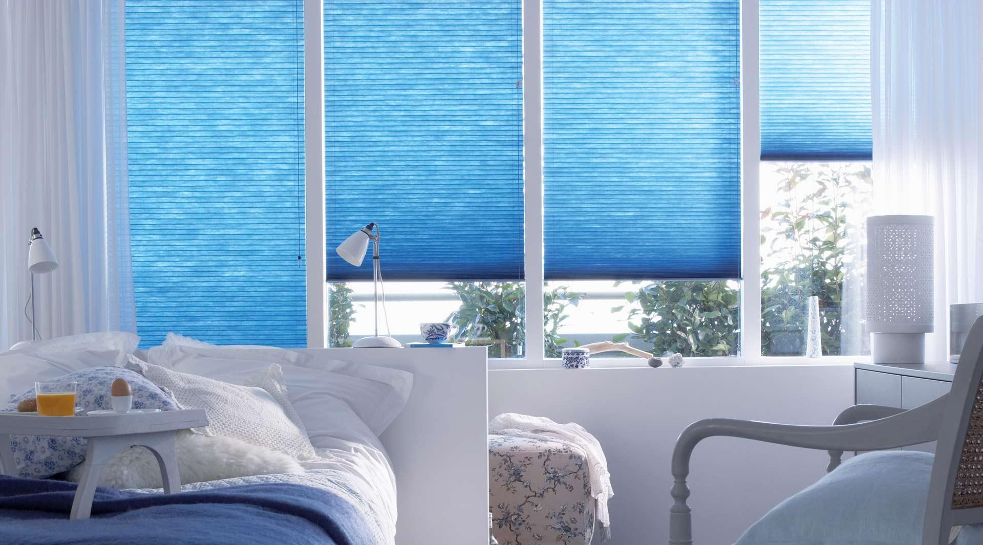 Окна в спальне желательно оформлять в спокойных тонах. Для этого подойдет декор синих, зеленых, пастельных оттенков. Выбирают жалюзи на окна того же цвета, что и остальной декор в комнате. Идеальная синяя палитра будет символизировать небо. Это положительно сказывается на психике человека.