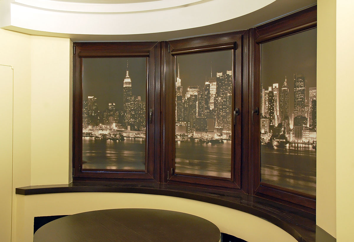 - Оформление окон. Если рулонные жалюзи на окна рассматриваются в качестве важного элемента в интерьере, акцент должен делаться на цветах в комнате. Цвет завеса может быть на несколько оттенков светлее стен или обеспечивать контрастность (в зависимости от стиля помещения). Ткань может быть пастельной, с рисунком — все зависит от личных предпочтений.