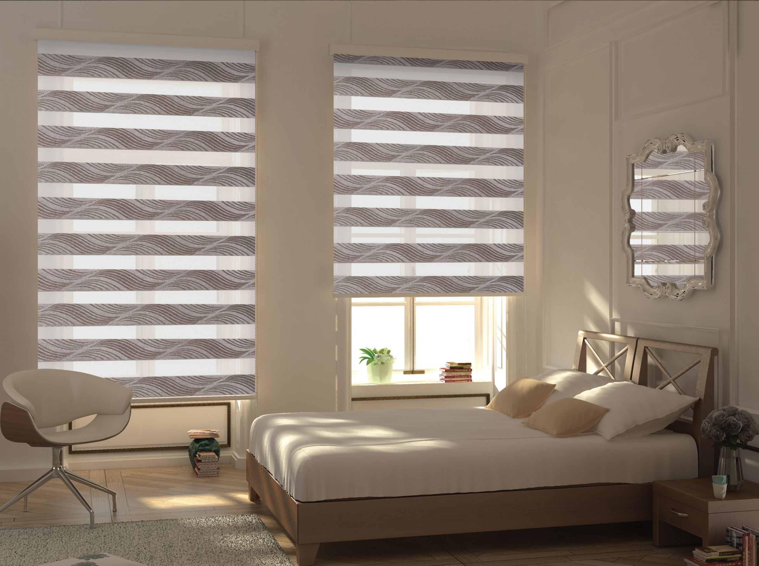 Особой популярностью пользуются шторы «день и ночь». Особая технология изготовления двойного полотна делает их универсальными для любой комнаты. Днем свет в достаточном объеме легко проникает в прозрачные полосы на ткани, а на ночь эти горизонтальные просветы задвигаются непрозрачными фрагментами и служат препятствием уличному свету, скрывают от посторонних глаз происходящее в квартире. Для регулирования уровня освещения завесы «день и ночь» точно так же полностью поднимаются и опускаются по принципу рулонной шторы.