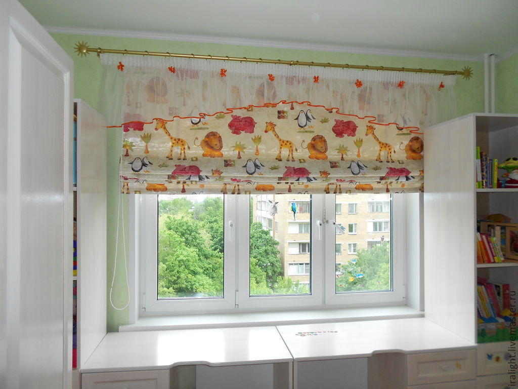 - детская комната — такие занавески считаются одним из лучших вариантов. В этом случае допустимо выбрать материал с изображением любимых мультипликационных героев малыша, цветов, ракет. Штора накапливает минимум пыли и отличается простотой в уходе;