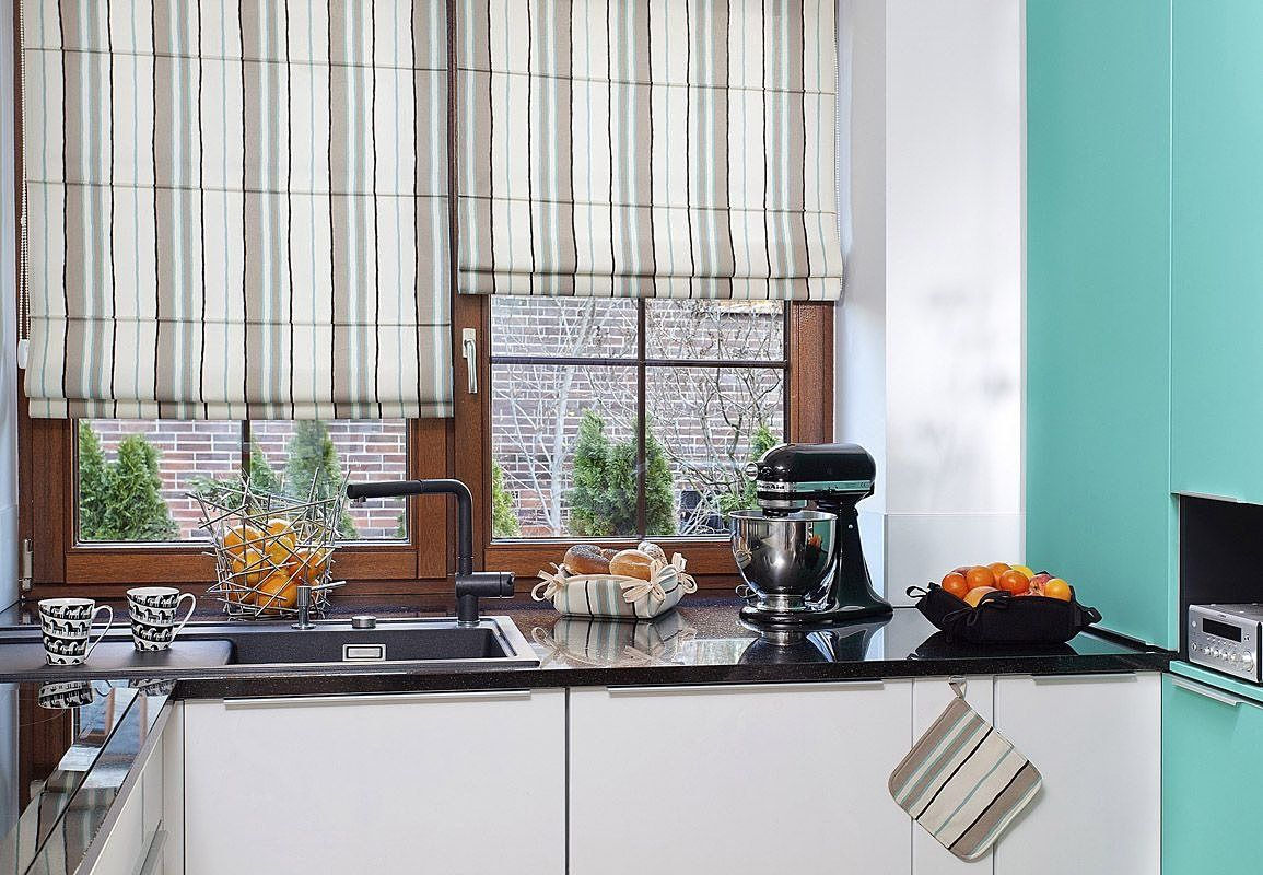 - кухня — подобные модели хорошо подходят для этого помещения. Они не загрязняются, имеют компактные размеры и легко очищаются. Судя по фото, римские шторы на кухню отличаются многообразием вариаций.