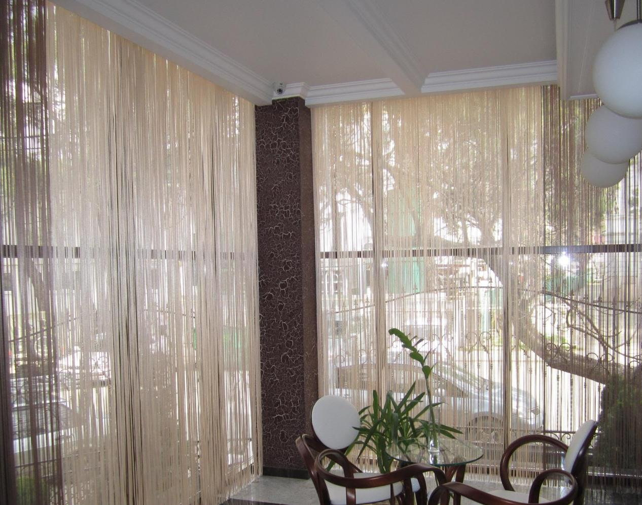 В последнее время большой популярностью пользуются нитяные шторы. В мире штор новая разновидность появилась недавно. Нити разного цвета, толщины, нанесенного рисунка закреплены на тканевой основе. Декорируют нити люрексом, бусинками, создавая водопад. Всегда есть свободный выход, легко раздвигаются руками в нужном месте.